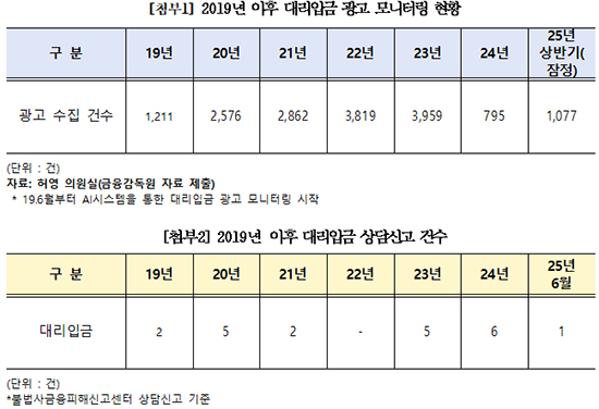 3ÀÏ ±¹È¸ Á¤¹«À§¿øÈ¸ ¼Ò¼Ó ´õºÒ¾î¹ÎÁÖ´ç Ç㿵 ÀÇ¿øÀÌ ±ÝÀ¶´ç±¹À¸·ÎºÎÅÍ Á¦Ãâ¹ÞÀº ÀÚ·á¿¡ µû¸£¸é, ´ë¸®ÀÔ±Ý ±¤°í Àû¹ß °Ç¼ö´Â 2019³â 1223°Ç¿¡¼­ Áö³­ÇØ 3959°ÇÀ¸·Î 5³â »õ 3¹è ÀÌ»ó ÆøÁõÇß´Ù. ±×·¯³ª Áö³­ÇØ Àû¹ß °Ç¼ö´Â 795°Ç¿¡ ºÒ°úÇØ Àü³â ´ëºñ 5ºÐÀÇ 1 ¼öÁØÀ¸·Î ±Þ°¨Çß´Ù. ÀÌ °°Àº ±Þ°¨Àº ±ÝÀ¶°¨µ¶¿øÀÇ ºÒ¹ý±ÝÀ¶±¤°í °¨½Ã½Ã½ºÅÛÀÌ 6°³¿ù°£ ¸¶ºñµÆ´ø Å¿À¸·Î È®ÀεƴÙ.
