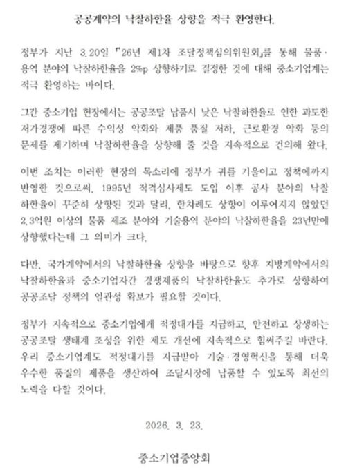 20ÀÏ Á¤ºÎ°¡ 2026³â 1Â÷ Á¶´ÞÁ¤Ã¥½ÉÀÇÀ§¿øÈ¸¸¦ ÅëÇØ ¹°Ç°¡¤¿ë¿ª ºÐ¾ß ³«Âû ÇÏÇÑÀ²À» 2%p ³ôÀ̱â·Î °áÁ¤ÇÑ °Í¿¡ ´ëÇØ Áß¼Ò±â¾÷µéÀÌ È¯¿µÀÇ ¸ñ¼Ò¸®¸¦ ³Â´Ù.